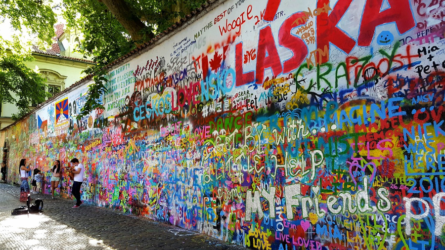 당시에 유행했던 존 레넌의 명곡 Imagine은 냉전을 협오하고 평화를 원하는 젊은이들에겐 상징적인 노래였고 국경을 넘어 체코의 젊은이들에게 많은 영향을 주었습니다. 30m가량 이어지는 벽면에는 그림과 글씨들이 빼곡하게 채워졌는데, 대사관은 치외 법권이라서 체코 정부가 낙서를 지울 수 없었고 자유와 평화를 열망하는 낙서가 모여 오늘날의 존 레넌 벽이 되었답니다.
