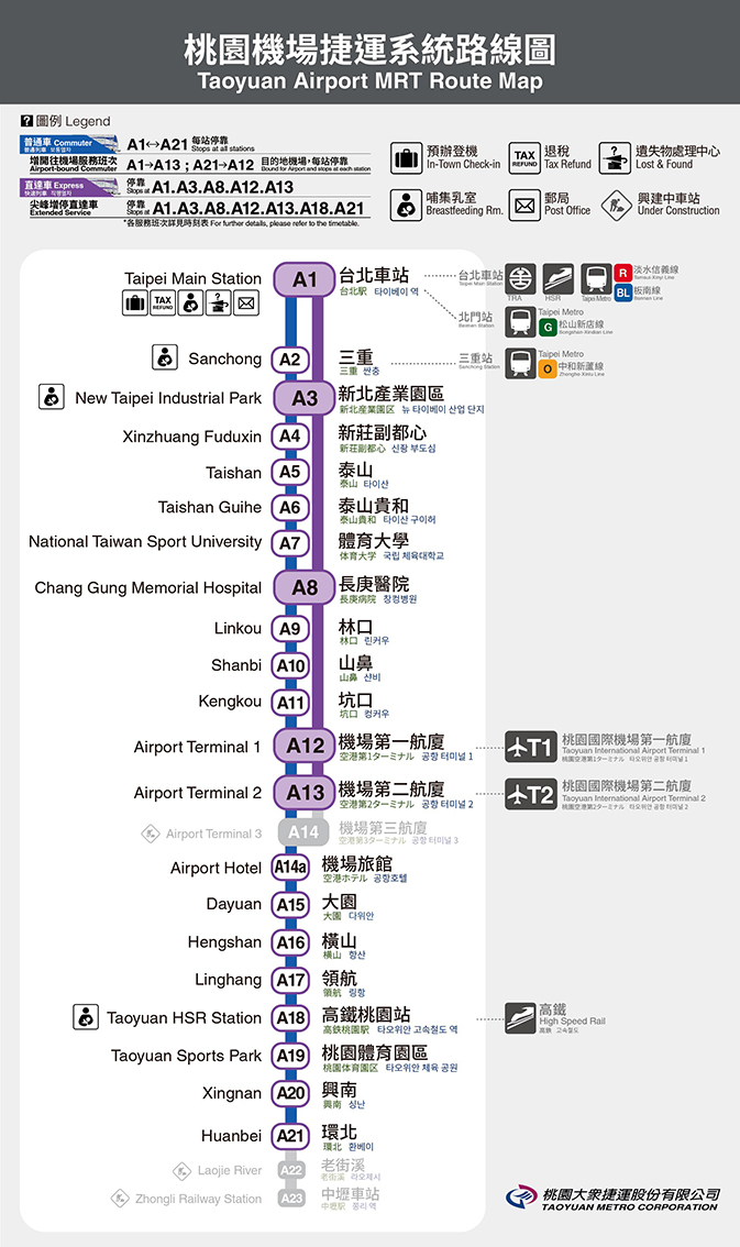 보라색 급행 노선은 은 타오위안 공항 1,2 터미널에서 장강병원, 뉴 타이베이 산업단지를 지나 타이베이 메인 스테이션까지 총 5개의 역을 거칩니다. 버스나 택시로는 1시간이 걸리니 이 정도면 정말 빠른 교통 수단입니다.