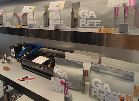 어 메뉴판이 있고 노트북을 사용할 수 있도록 전기 콘센트가 있는 카페입니다. 직접 수입한 원두를 볶아서 판매하는데 구매가 가능하고 가비만의 굿즈들도 구입할 수 있습니다.