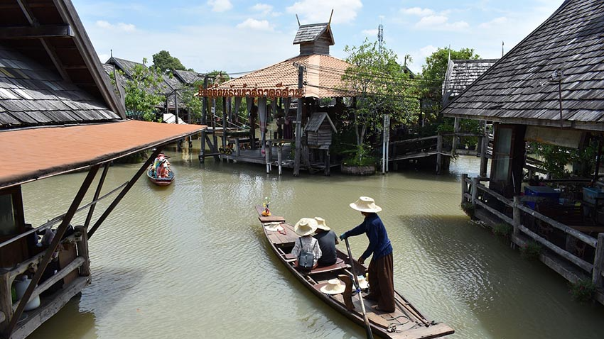 먹거리와 전통 공예품 등을 판매하는 110여 개의 상점이 수로를 따라 늘어서 있습니다. 수상시장의 풍경을 바라보며 즐길 수 있는 마사지 가게도 있습니다. 시장 입구에서 출발하는 배를 타고 수상 시장을 돌아볼 수 있습니다.