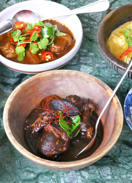 특별한 재료로 만들어진 요리 중에 유명한 것은 나시 케라부가 첨가된 비프 치크 렌딩과 땅콩소스에 파인애플 잼이 첨가된 사테이 푸아그라, 만토우가 어우러진 칠리 크랩 아이스크림입니다.