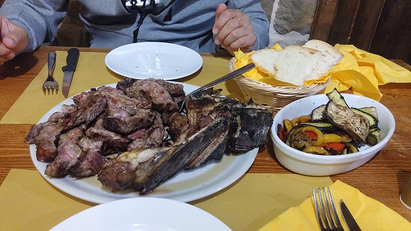 피렌체의 대표 전통 음식은 등심과 안심을 모두 맛볼 수 있는 티본스테이크입니다. 크기는 무려 1.2kg~1.8kg 정도이며 두께는 3cm 이상입니다. 숯불에 향이 좋게 구워서 고기의 육즙이 살아 있으며 육질 또한 부드럽습니다. 오븐 구운 감자와 채소 혹은 신선한 샐러드를 곁들여 먹습니다.