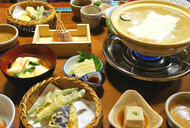 양파와 생각, 빨간 고추를 넣은 맑은 국물에 삶은 두부 요리 유도후가 이 집의 메인 요리입니다. 두부에 별다른 간을 하지 않아서 담백하게 즐길 수 있습니다. 가격은 유도후 정식이 2200엔 정도입니다.