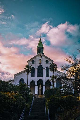 고딕 양식으로 웅장하게 지어졌으며 뾰쬭하게 솟은 녹색 첨탑과 아름다운 스테인드 글라스가 신비롭고 매력적인 건축물입니다. 일본에서 가장 오래된 목조 성당으로 내부는 스테인드글라스가 내뿜는 형형색색의 빛으로 아름다우며 제단 위에는 십자가 상의 예수와 마리아를 그린 그림이 경건함을 더해 줍니다.