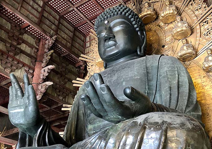 세계에서 가장 큰 청돌 대불이 있는 도다이지는 나라에서 가장 유명한 장소입니다. 청동 대불의 무게는 약 300톤에 달한다고 합니다.