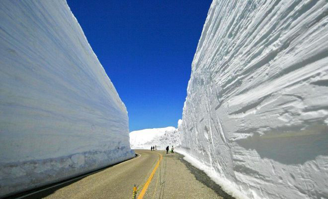 겨울 동안 쌓인 눈이 20m에 달할 만큼 쌓이며, 봄이 되면 일부 구간을 제설해 관광객이 도보로 지나갈 수 있게 개방됩니다. 하얀 벽이 좌우로 늘어선 도로는 마치 눈 속 협곡을 걷는 듯한 장관을 자아냅니다.