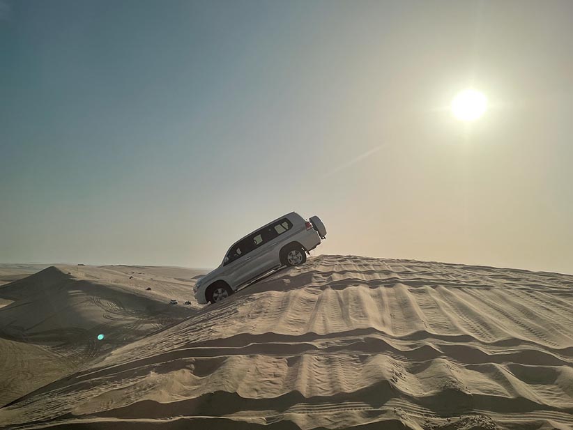 모래 언덕 너머로 붉게 물드는 노을을 감상하려면 카타르의 사막으로 모험을 떠날 수 있습니다. 사륜구동 차량을 타고 카타르의 모래언덕 위를 달릴 수도 있습니다.