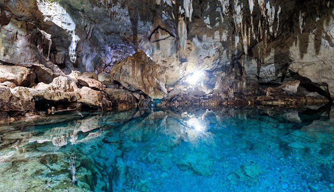 동굴 천장에서 햇빛이 쏟아져 들어와 호수의 색감과 어우러져 이국적이고 신비한 분위기를 만들어 냅니다. 꼭 수영을 하지 않아도 동굴을 돌아보며 사진 촬영을 하기에도 더없이 좋은 곳입니다.