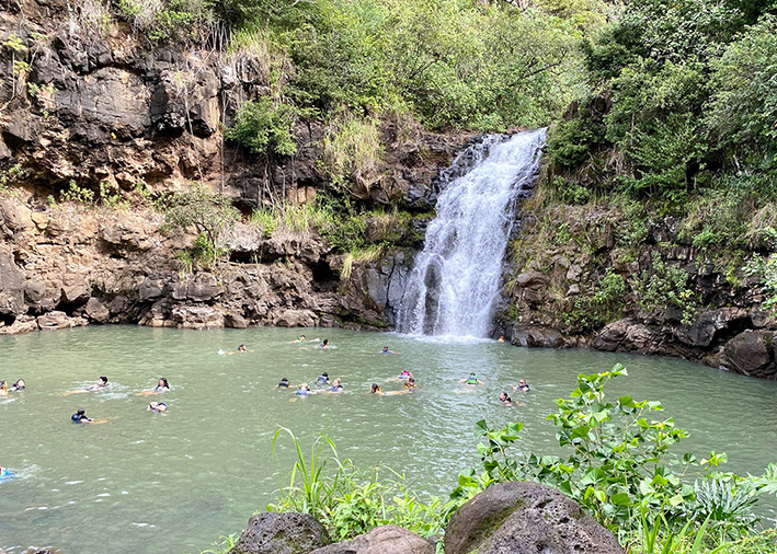폭포의 높이는 약 10m이고 그 아래는 자연의 경치를 즐기며 수영할 수 있습니다. 하와이는 화산섬으로 물에 철분이 많아서 언뜻보면 탁해 보이지만 실제로는 아주 깨끗한 물이랍니다.